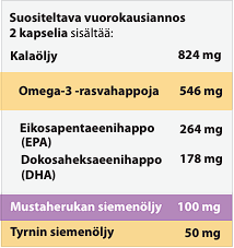 Suositeltavaa vuorokausiannosta ei saa ylittää. Ravintolisä ei korvaa monipuolista ja tasapainoista ruokavaliota eikä terveitä elämäntapoja. Säilytettävä pienten lasten ulottumattomissa. Säilytettävä viileässä.